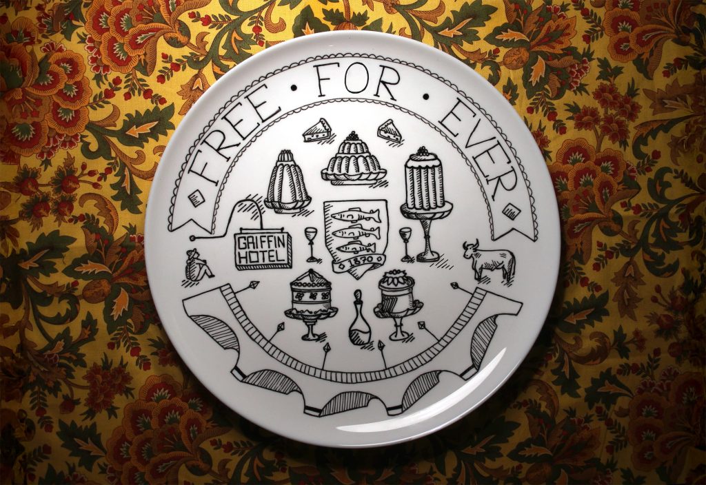 The work: A hand-illustrated 32cm commemorative plate to celebrate the freeing of Kingston Bridge from tolls on 12 March 1870. While the poem is an elegy for the toll-man, the plate is a celebration of the high Victorian festivities. Inspired by old photographs and a printed menu from the day, the illustrations tell a story of banners, jellies, and pies — charming, whimsical and fun.