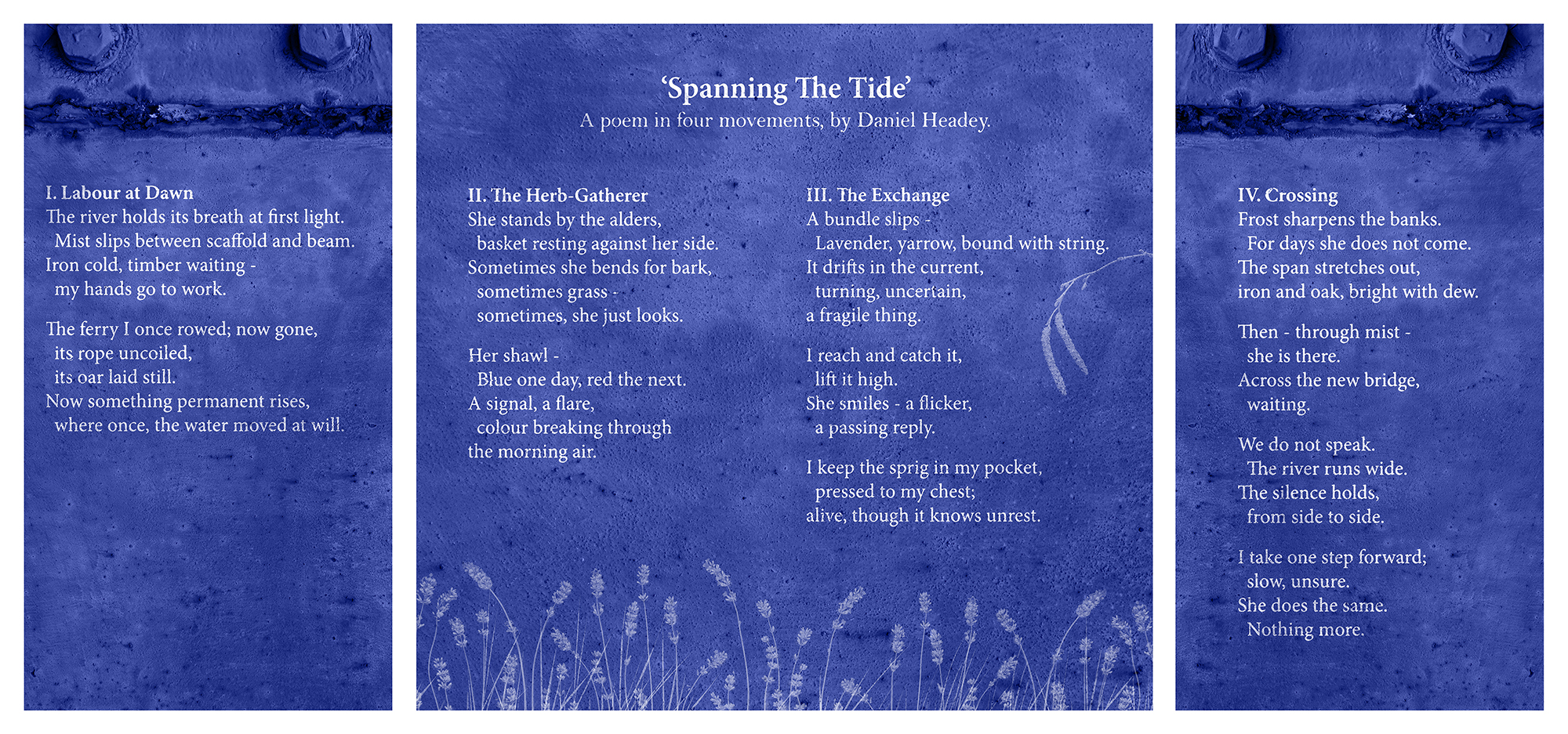 Description: A poem in four movements based in 1888/1889 when the Teddington Lock bridges were built. Inspired by the small island in the middle and its flora and fauna and by the boat workers who changed jobs to help build the structure. A story of two different people meeting. Fleeting moments. Quick glances. As life (and the water) flows on, where will their journey take them?