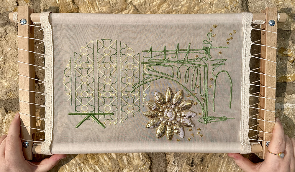Description: A 21-line poem written to capture the seasons of and visitors to the iconic toll bridge which depends on flood levels to allow passage via the toll way. An intricately hand-embroidered piece depicting key architectural design details of the bridge and its surroundings, including: floral emblems, waterfowl footprints, flood level gauge, the arch of the bridge, and the ever-changing sheen and flow of the river spilling through the raised and lowered bridge.